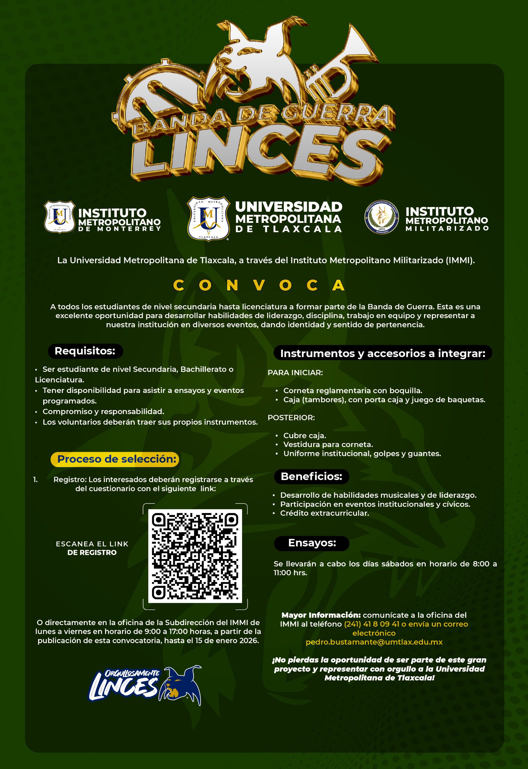 ¡Haz que tu ritmo resuene y tu espíritu se alce! Únete a nuestra banda de guerra y marca la diferencia con cada nota y cada paso.